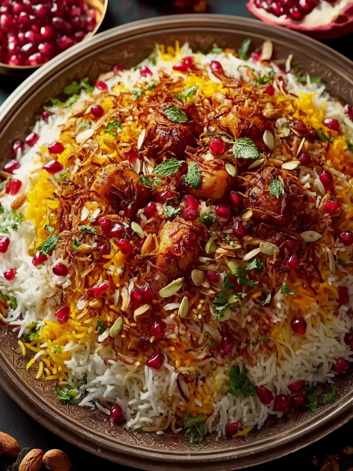 A fragrant dish of basmati rice infused with saffron, nuts, and dried fruits.