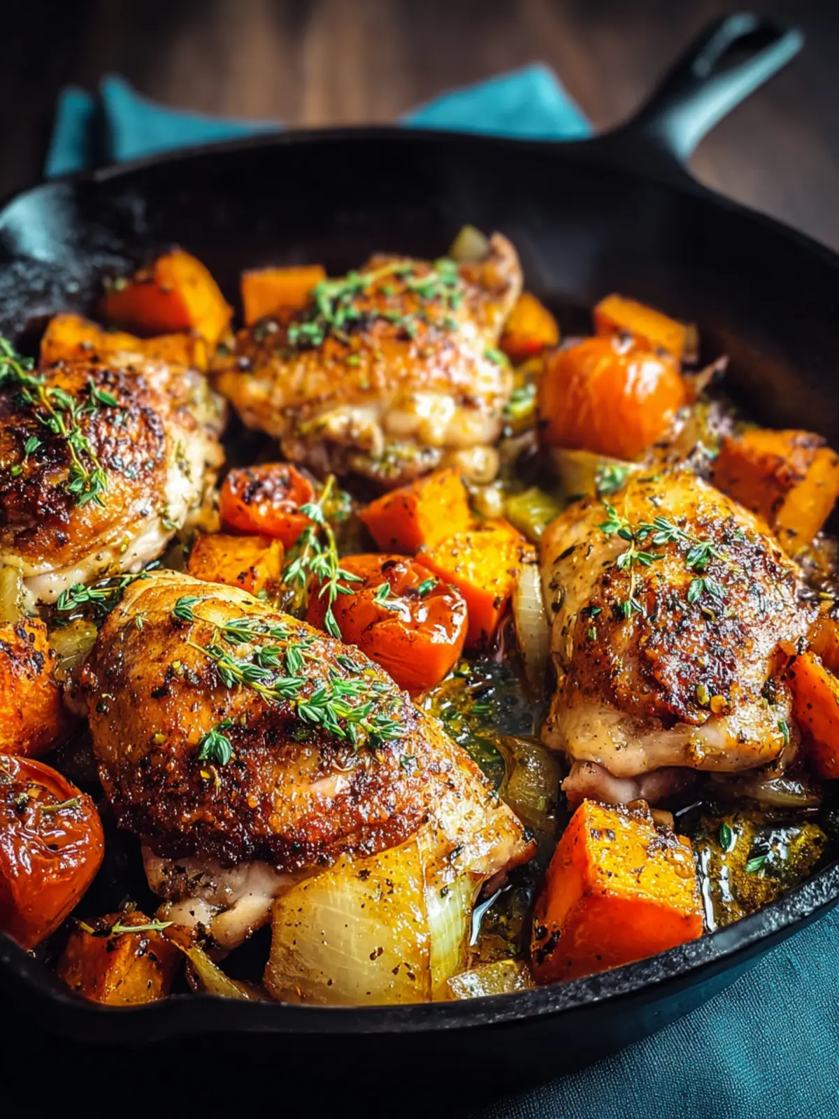 A delicious and easy recipe featuring sautéed chicken thighs, sweet potatoes, and aromatic herbs.